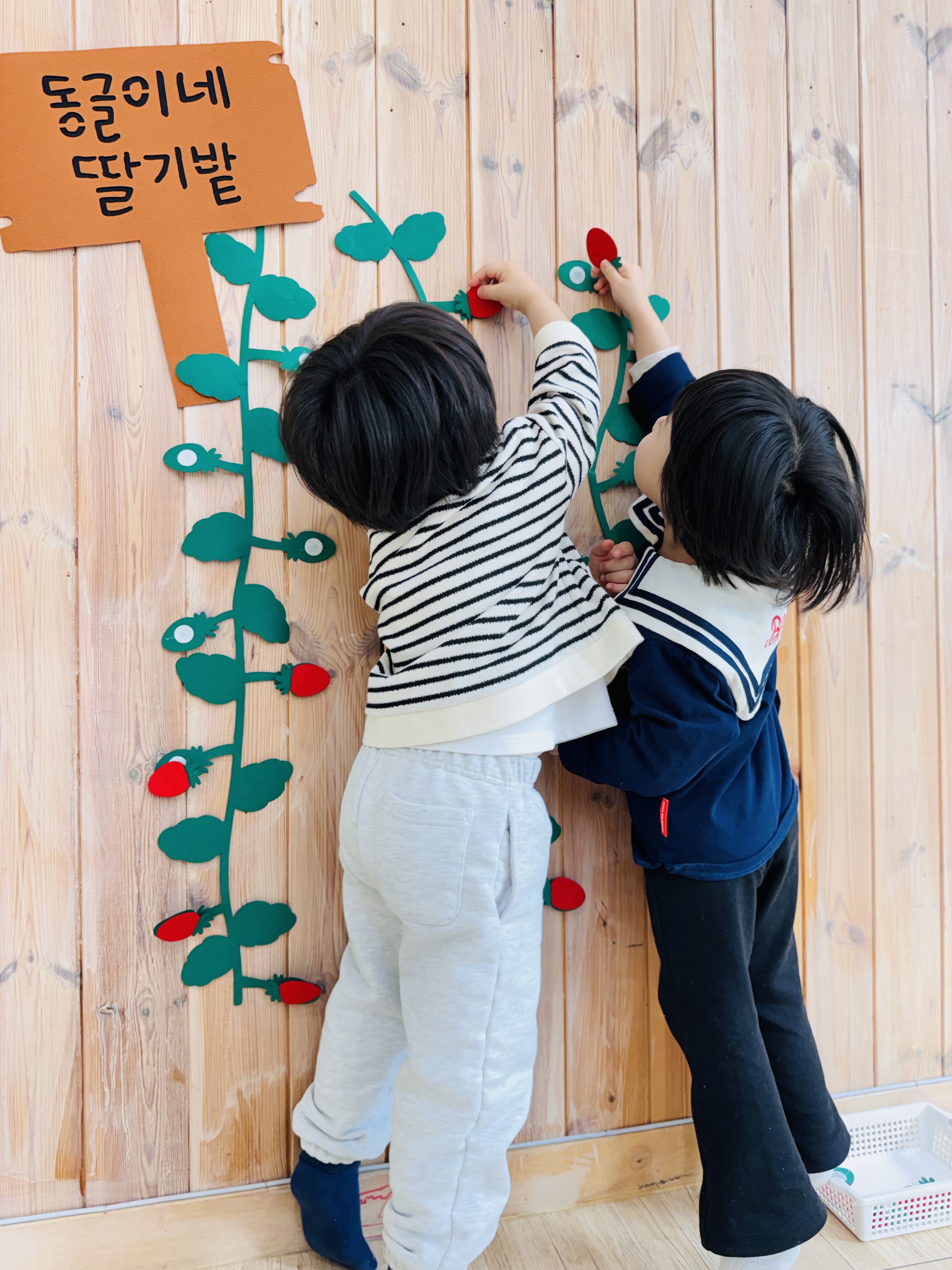 아이들이 너무 좋아하는 딸기가 교실에 왔어요 동글이네 딸기밭으로 먹기만 하던 딸기를 빼었다 붙였다 놀이로 하니 너무 재미있어하네요.. 단순 놀이뿐 아니라 교실이 빨강 초록으로 화사해져서 봄이 다가온 것을 또 느끼네요 딸기 따기를 놀이를 할 수 있어서 교실에 웃음이 끊이질 않아요.