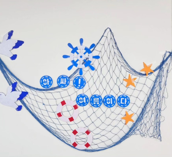 여름그물환경판 반제품은 펠트도안으로 재단 되어 나가는 제품입니다.갈매기2,튜브2개,불가사리3,핸들1,(아싸여름이다)펠트가랜드 펠트도안을 글루건으로 붙여주시기만 하면 완성이 됩니다.감사합니다ㅣ.