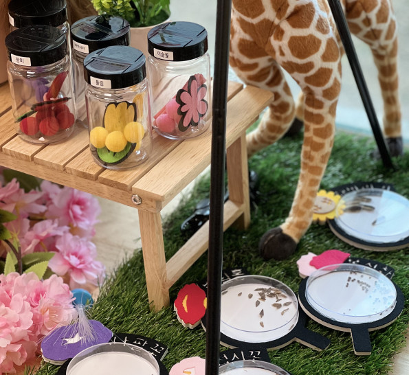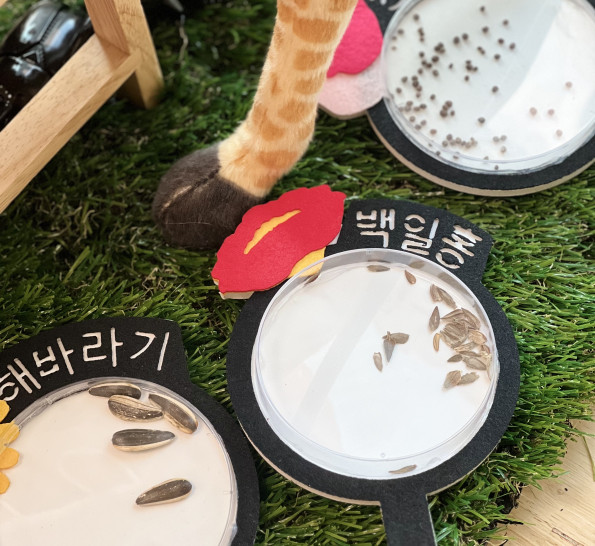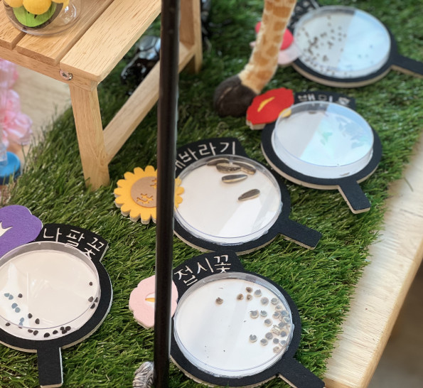 돋보기 안에 다양한 씨앗이 들어 있어 아이들이 직접 들여다보며 “모양이 다르다”, “이건 무슨 씨앗일까?” 하고 자연스럽게 이야기도 나누고 손에 쥐기 좋은 크기라 만 4~5세 아이들도 스스로 관찰하기 좋았답니도 :)