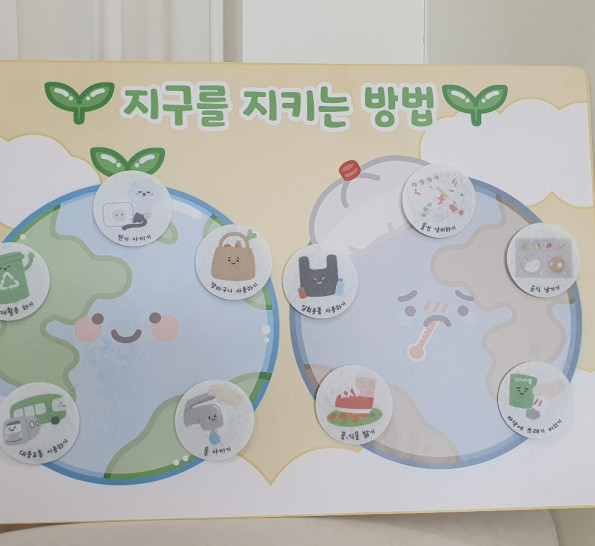 아이들 스스로가 이행동은 지구를 지키는 일 또 다른행동은 지구를 아프게 하는 일 하면서 서로 의견을 나누는데 우리 아이들 다 컸구나 했습니다. 더 많은 교구들로 아이들이 지구를 지키는 방법을 알아보고 지구지킴이가 되자고 약속했네요..감사해요..