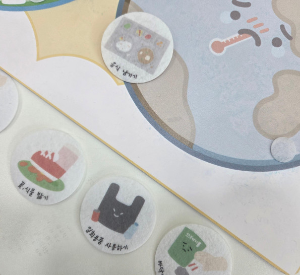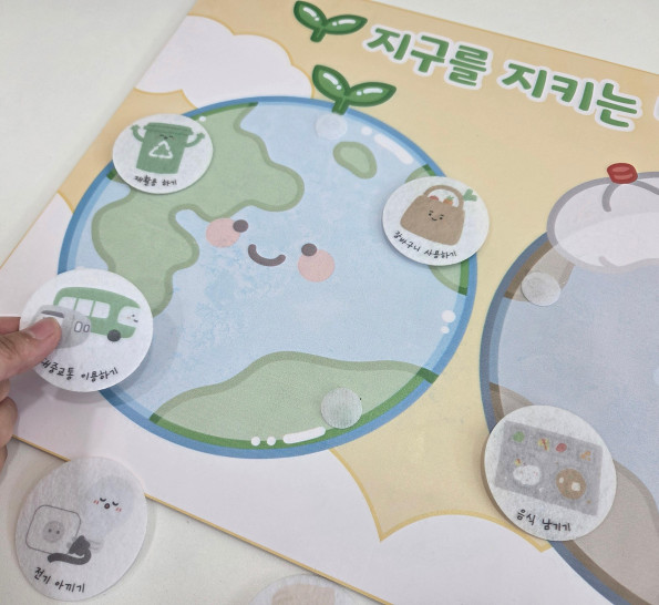 6월달 환경의날 설명을 하면서 우리가 지구를 지키는 방법에 대해 수업을 하는데 말로만 설명해서는 아이들이 실감을 못하잖아요.. 벨크로로 떼었다 붙였다 하는 교구가 있어서 너무 편한 수업이었어요..